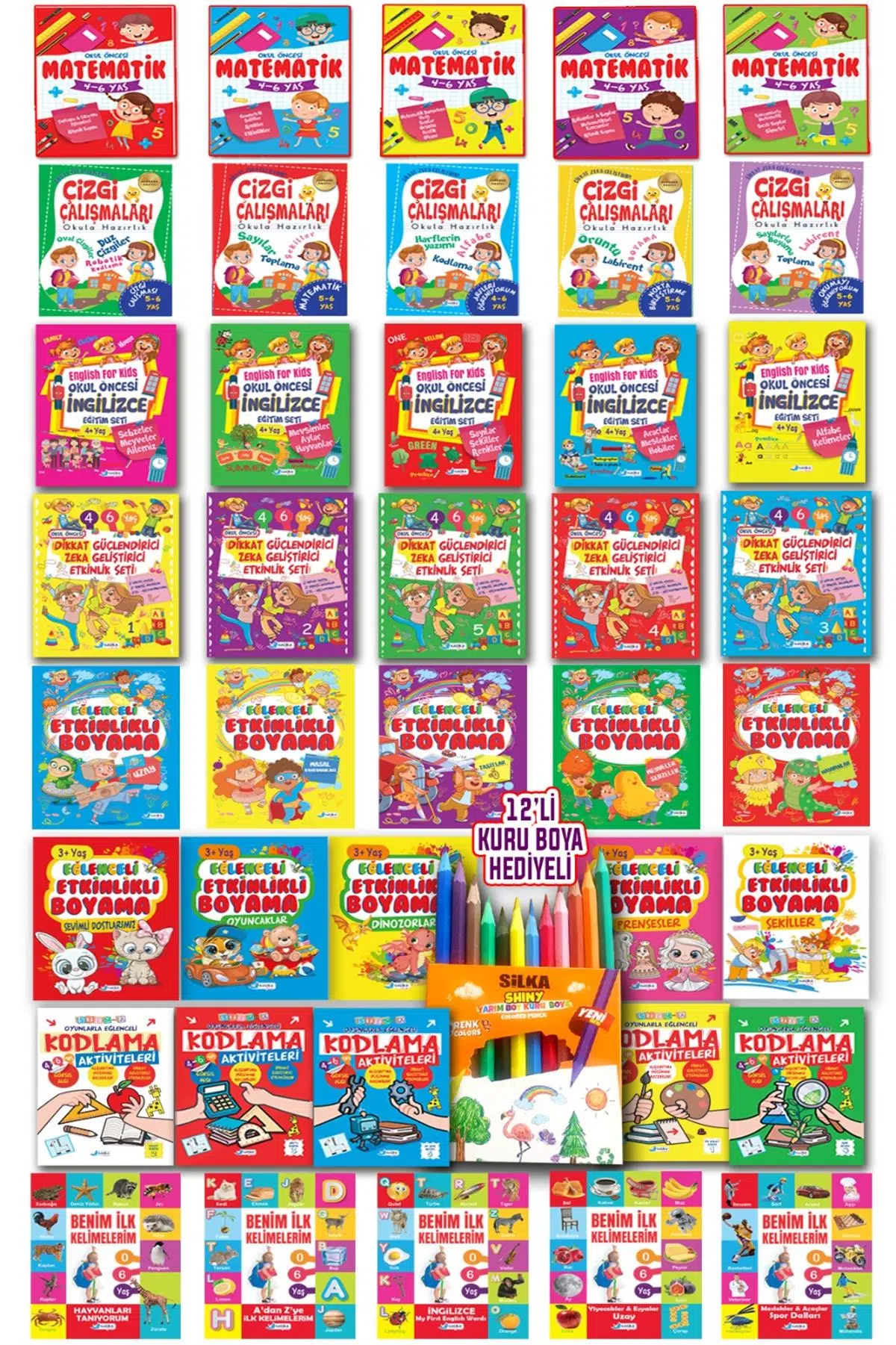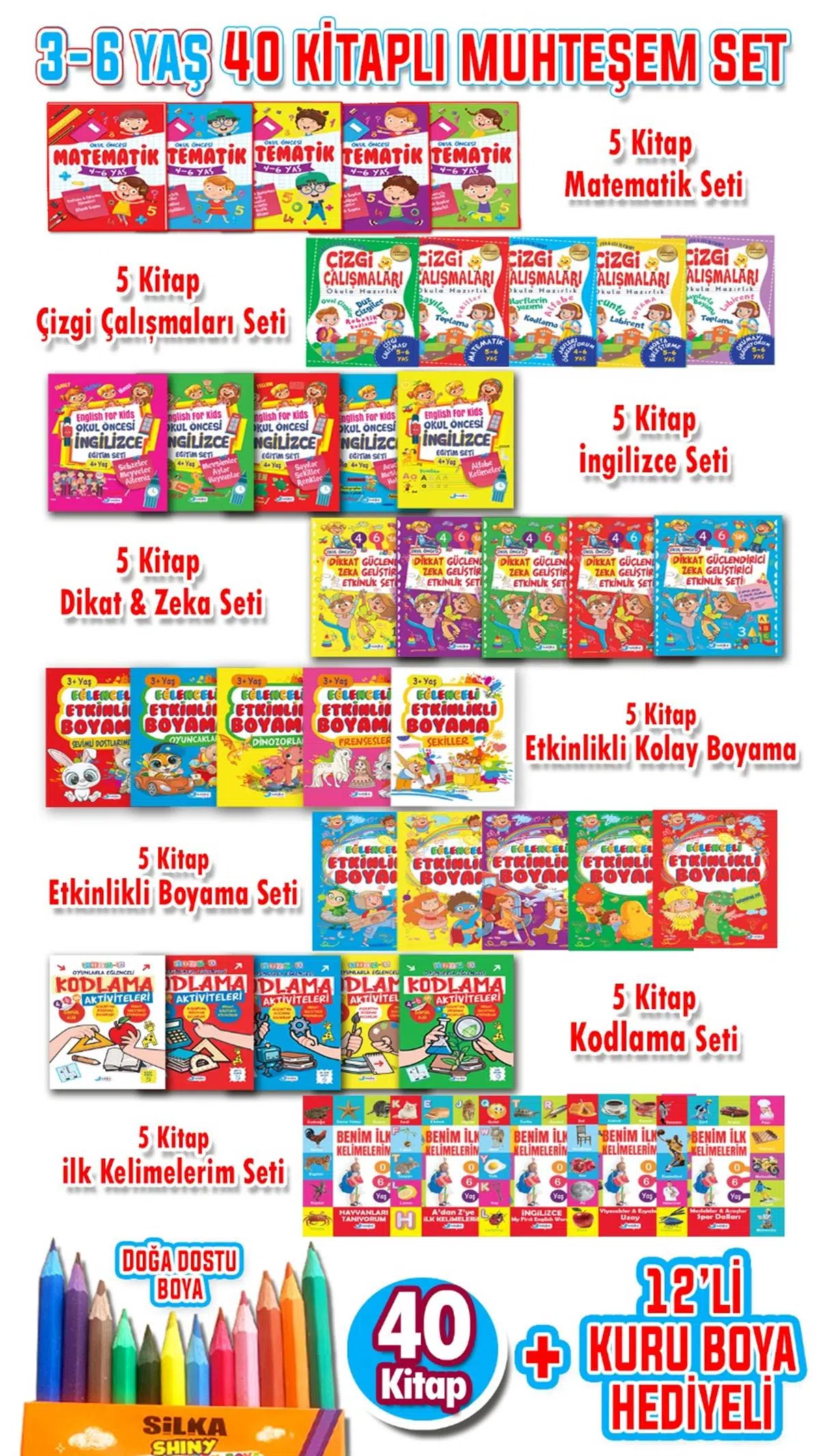 | Etiketler | 3 - 6 Yaş 40 Kitaplı Okul Öncesi Eğitim Seti 12 adet Kuru Boya Hediyeli |