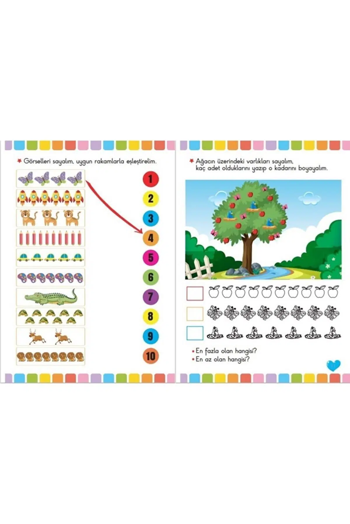 Matematik çalışmaları içinde; düşünme, dikkat, farkları bulma, sayma, sınıflandırma, ölçme, ayırt etme, bire bir eşleme, ritmik sayma, eşleştirme, gruplama, rakamları tanıma, nesnelerle toplama ve çıkarma yapma... gibi sayfalar bulunmaktadır.