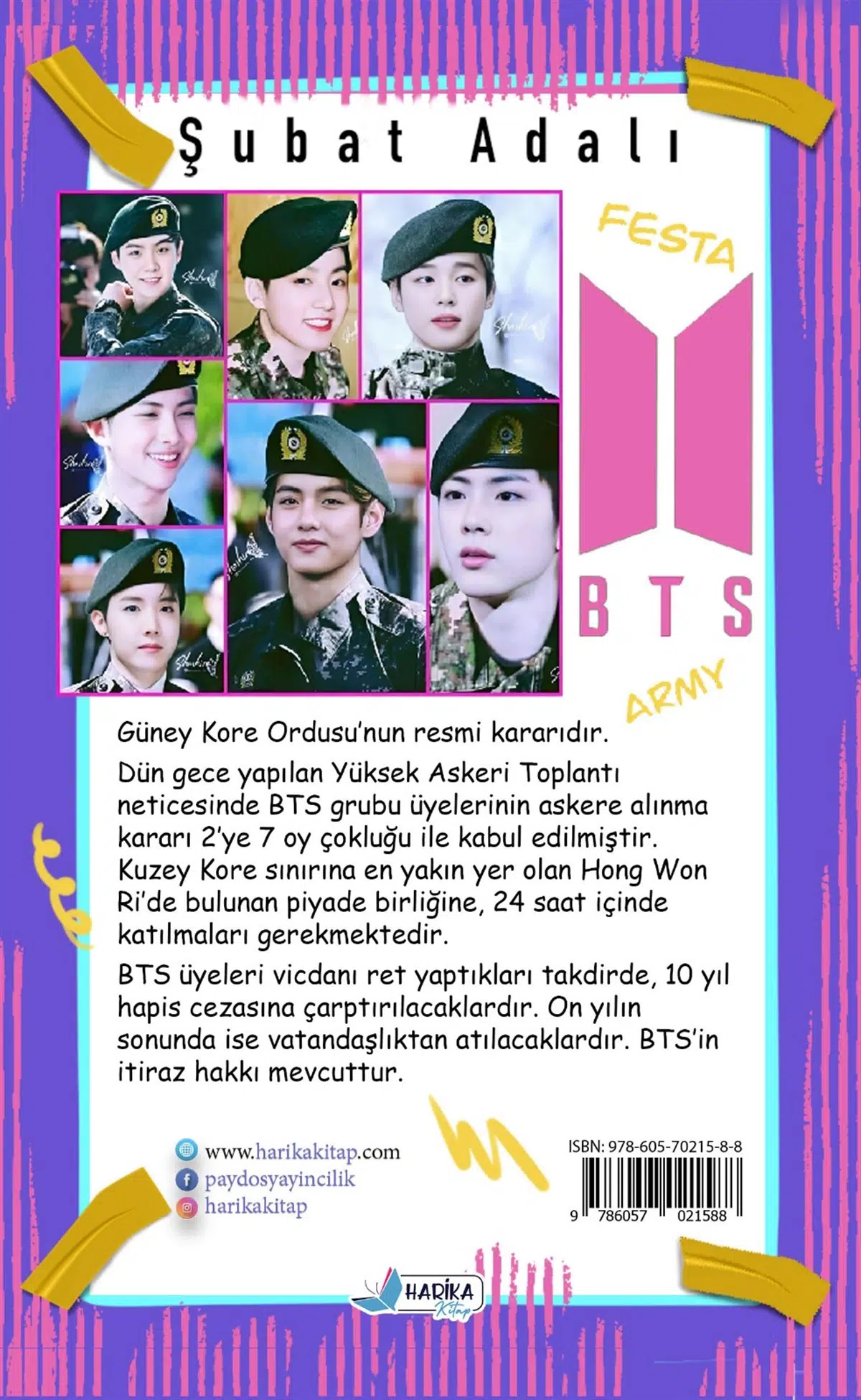 K-Pop’un efsane grubu BTS’nin askere alınmasıyla ilgili yazılmış olan bu kurgu roman, hem çok eğlenceli ve komik hem de gençler için kişisel gelişim kitabı özelliği taşımaktadır.